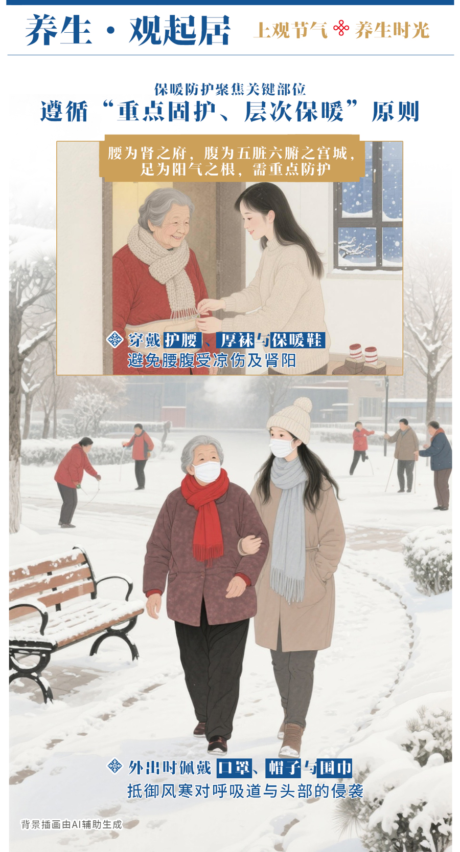 保暖防护聚焦关键部位,遵循“重点固护、层次保暖”原则。腰为肾之府,腹为五脏六腑之宫城,足为阳气之根,需重点防护。穿戴护腰、厚袜与保暖鞋,避免腰腹受凉伤及肾阳;外出时佩戴口罩、帽子与围巾,抵御风寒对呼吸道与头部的侵袭。