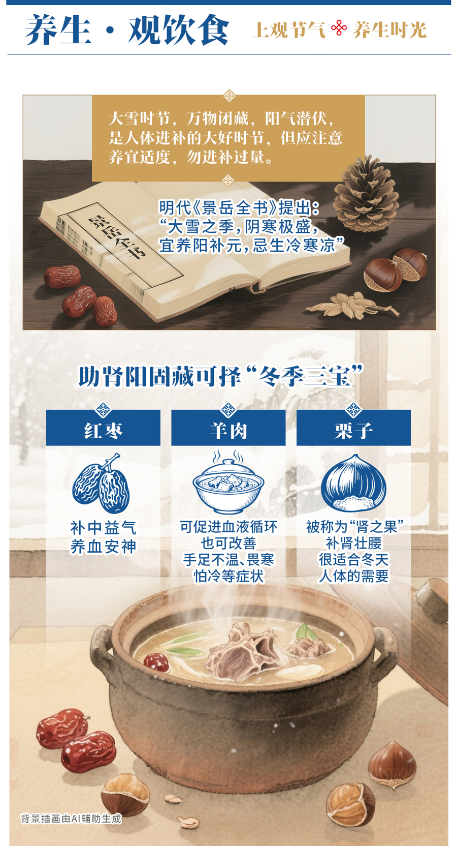 大雪时节,积雪冰封,万物闭藏,阳气潜伏,是人体进补的大好时节,但应注意养宜适度,勿进补过量。明代《景岳全书》提出:“大雪之季,阴寒极盛,宜养阳补元,忌生冷寒凉”,建议饮食以温补为主。可以选择羊肉、桂圆、栗子等。