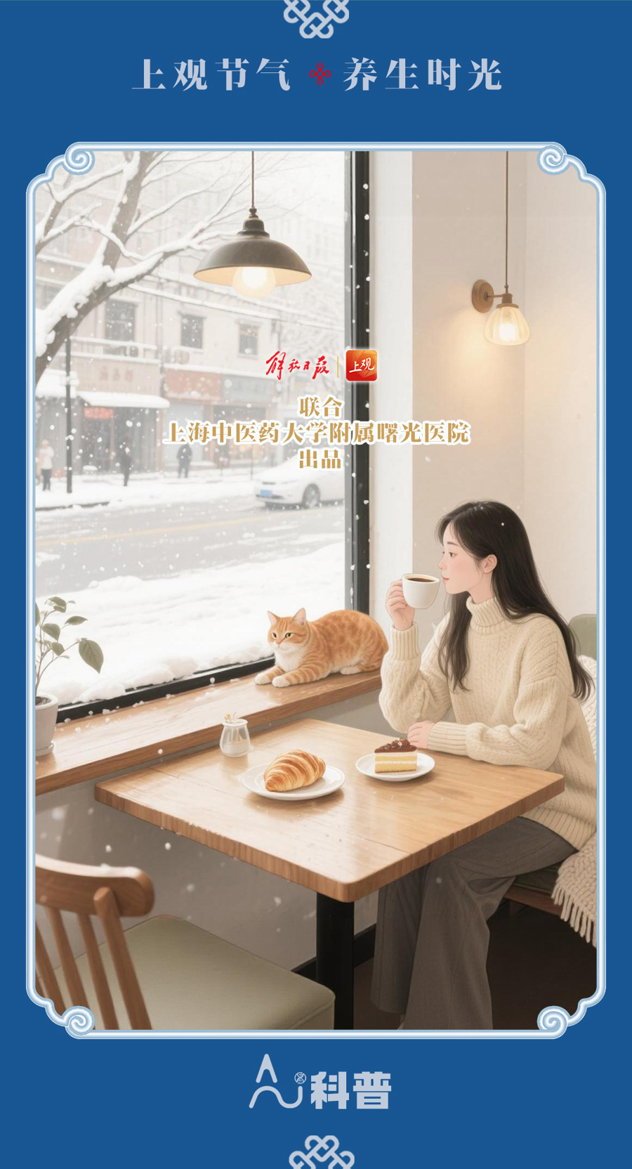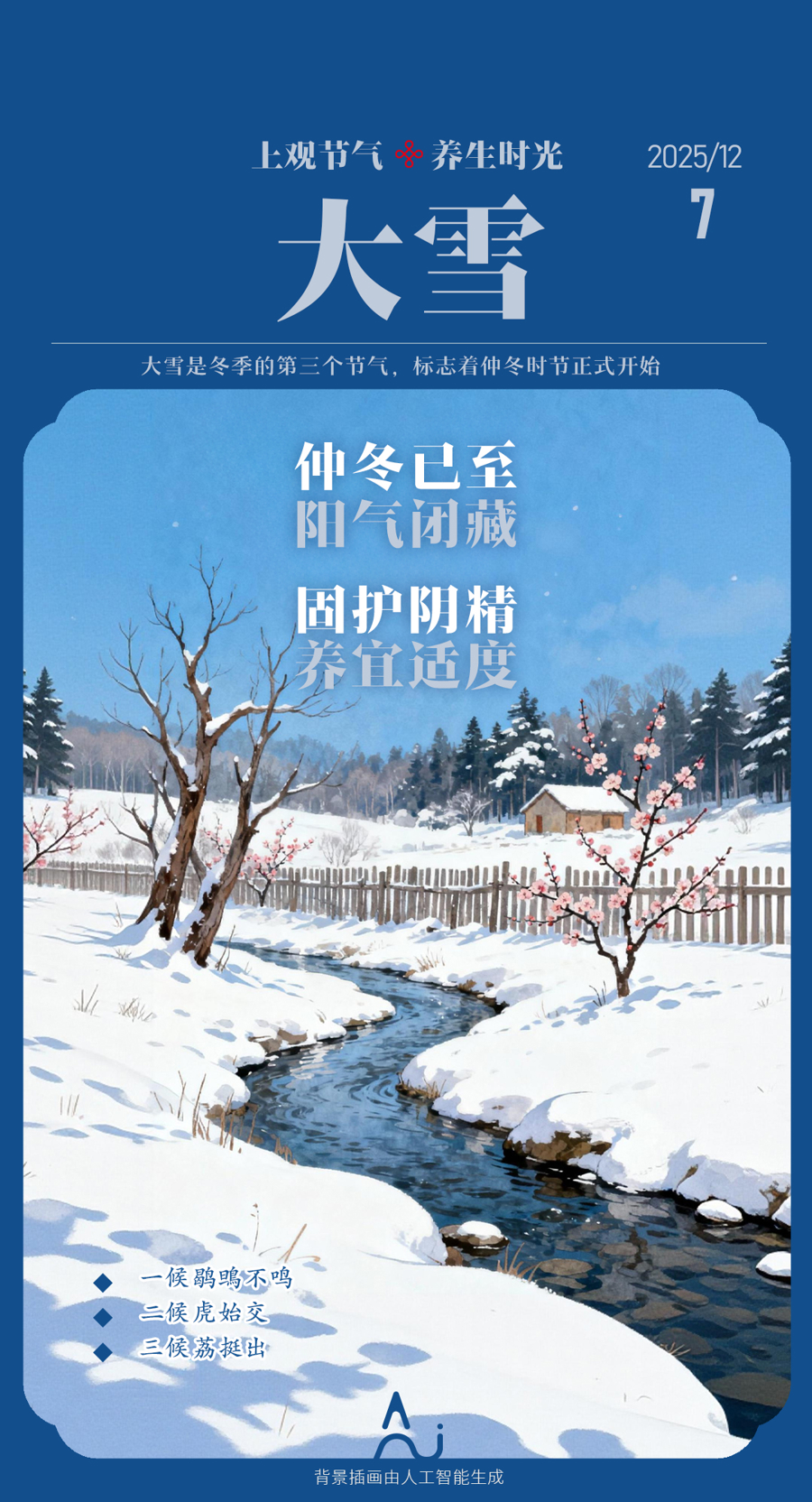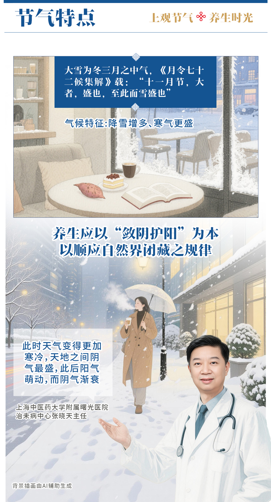 大雪是冬季的第三个节气,标志着仲冬时节正式开始,此时天气变得更加寒冷,天地之间阴气最盛,此后阳气渐升,而阴气渐衰。故养生应以“敛阴护阳”为本,以顺应自然界闭藏之规律。