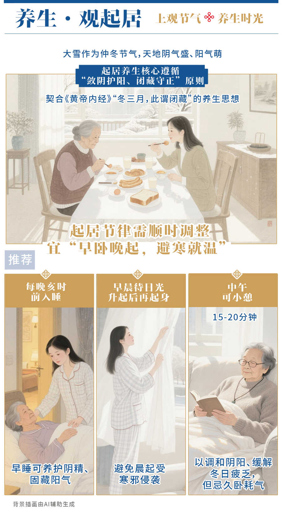 大雪作为仲冬节气,天地阴气盛、阳气萌,起居养生核心遵循“敛阴护阳、闭藏守正”原则,契合《黄帝内经》“冬三月,此谓闭藏”的养生思想。起居节律需顺时调整,宜“早卧晚起,避寒就温”。建议每晚亥时前入睡,早睡可养护阴精、固藏阳气;早晨待日光升起后再起身,避免晨起受寒邪侵袭。中午11:00-13:00可小憩15-20分钟,以调和阴阳、缓解冬日疲乏,但忌久卧耗气。