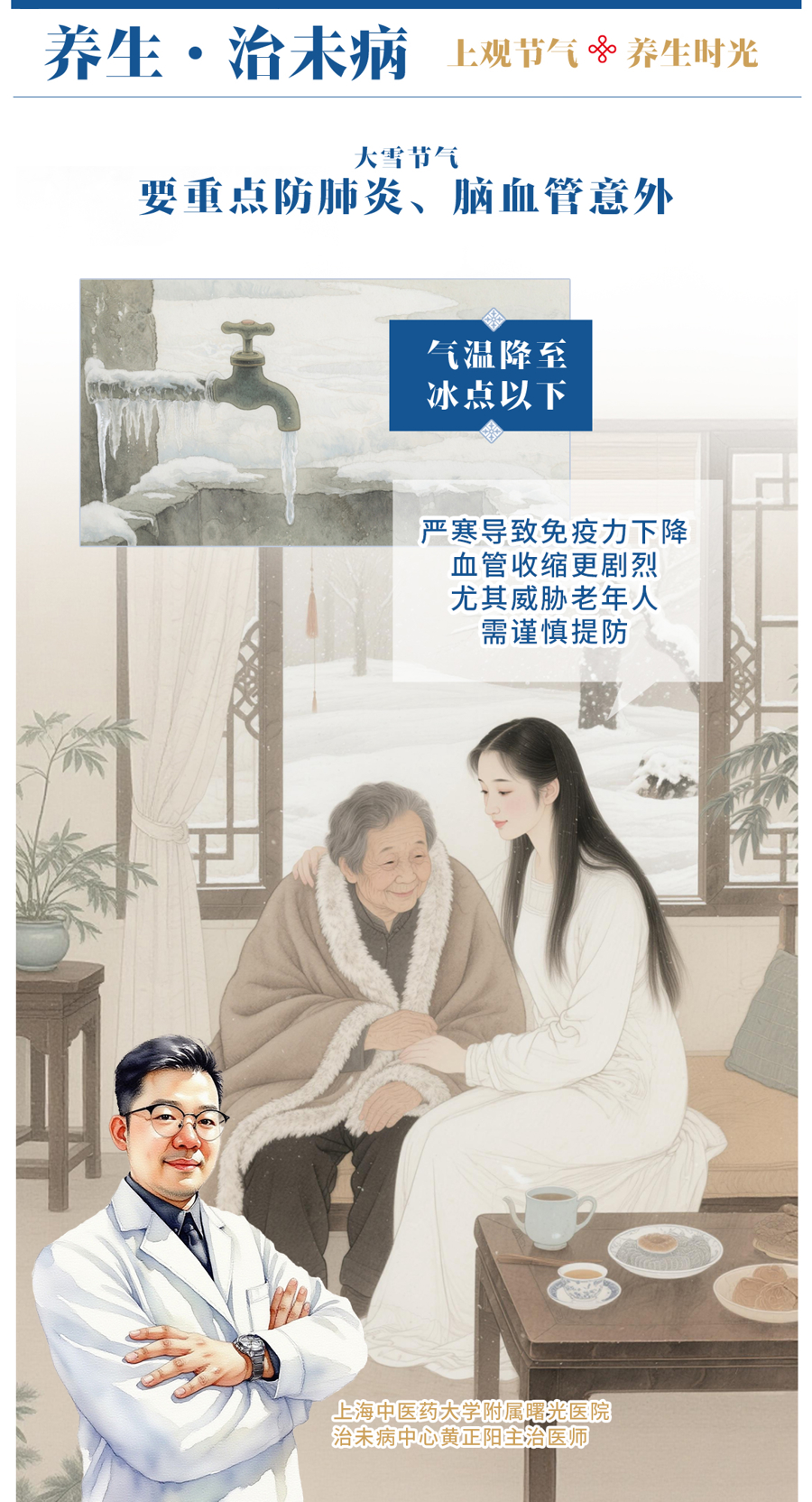 大雪节气要重点防肺炎、脑血管意外。气温降至冰点以下,严寒导致免疫力下降,血管收缩更剧烈,尤其威胁老年人,需谨慎提防。